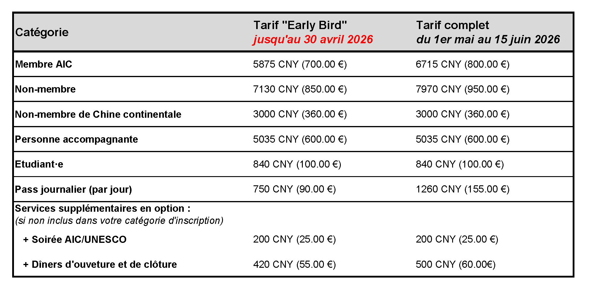 Pour toute question concernant votre inscription ou votre paiement, veuillez contacter : JINGDEZHEN SECRÉTARIAT DU CONGRÈS AIC ** LES MEMBRES COLLECTIFS peuvent inscrire jusqu’à deux représentant·e·s au tarif préférentiel réservé aux membres de l’AIC. Veuillez envoyer les noms complets et les adresses électroniques des représentant·e·s au Secrétariat du Congrès de Jingdezhen et attendre leur confirmation avant de procéder à l’inscription. |