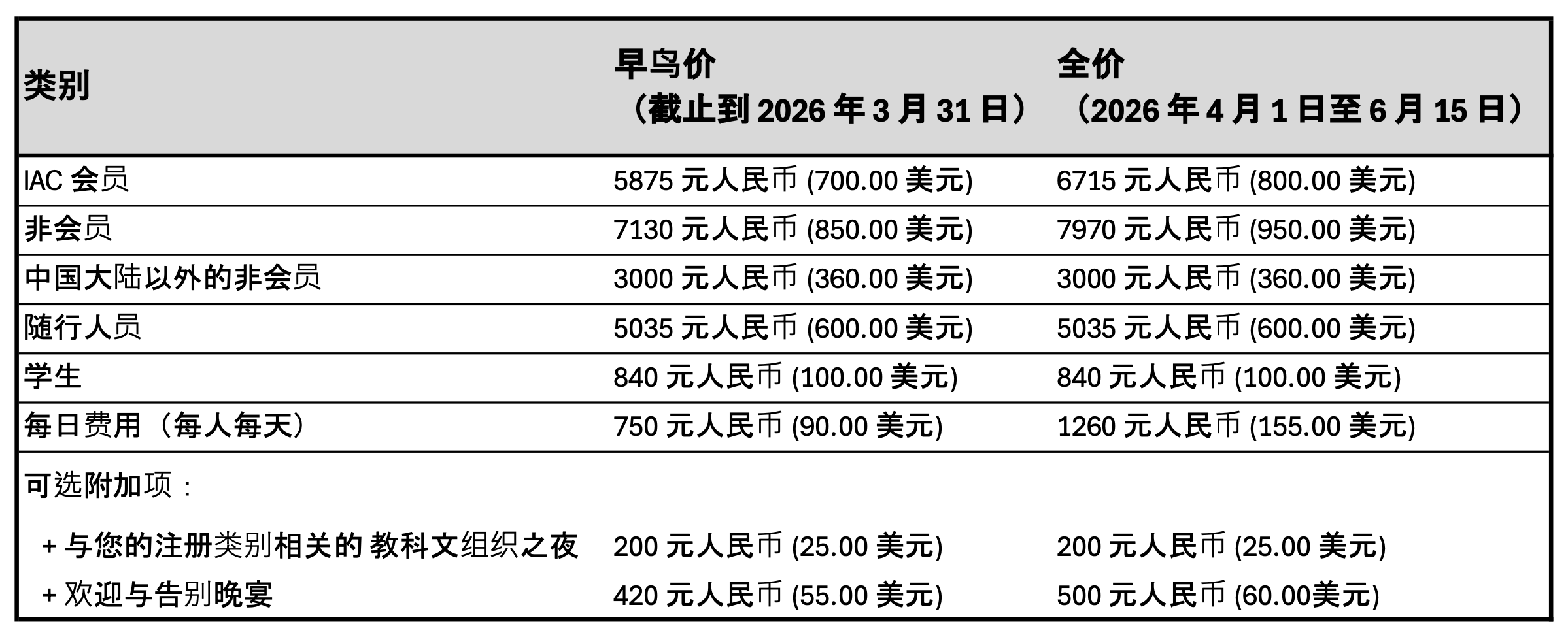 * 注册费用包含大会期间 6 晚酒店住宿(详见上文)。如需提前抵达,可额外付费延长住宿,主办方将确保您全程入住同一间客房。6 月 26 日起可在现场提前办理注册。离店日期固定为 7 月 3 日。 ** 2026 年 6 月 27 日(周六)为注册日,参会者可自由探索或休息,为大会做准备。当日餐饮及活动费用由参会者自行承担。 *** 2026 年 6 月 27 日(周六)设有充足自由活动时间,供参会者参观本地遗址。遗址门票免费,但往返交通需参会者自行安排,主办方不提供相关服务。 |
